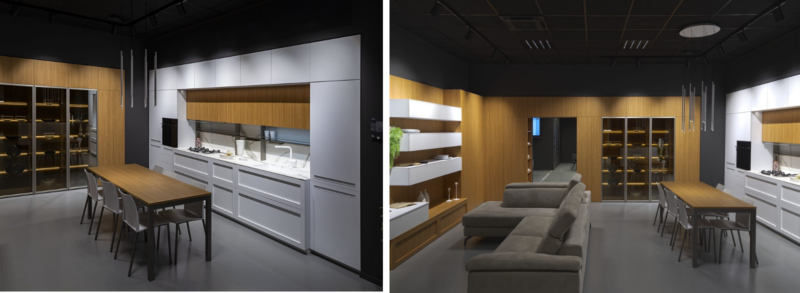 Un sistema di pensili e luci led che valorizza la carta da parati dietro al divano, creando un`atmosfera unica.
